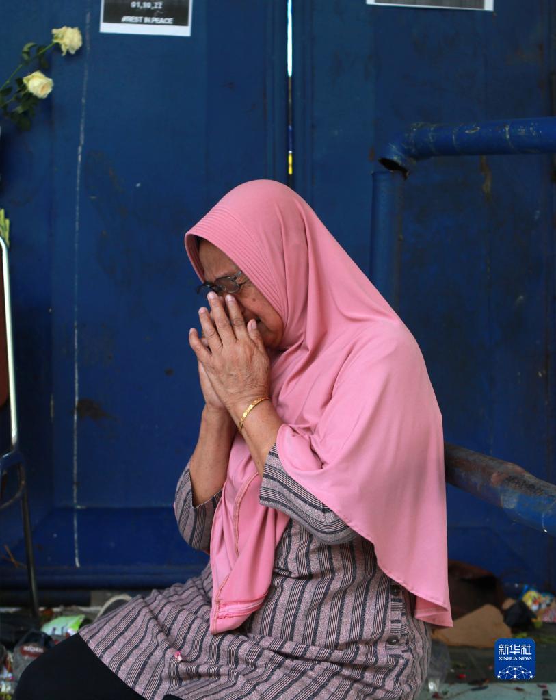 10月4日,一名妇女在印度尼西亚东爪哇省玛琅市事发球场的入口前哭泣,悼念踩踏事件遇难者。