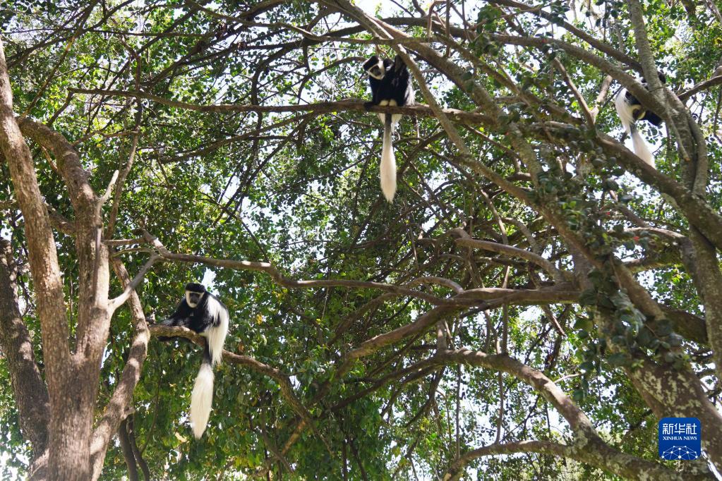 这是10月5日在肯尼亚纳纽基拍摄的东非黑白疣猴。