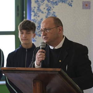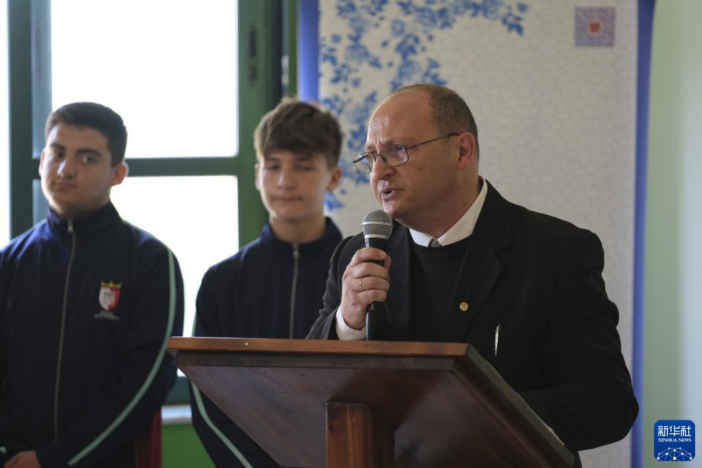 10月6日,马耳他科斯皮夸市圣玛格丽特中学科学老师、“中国角”创办人阿佐帕迪参加复信转交仪式时讲话。新华社发(乔纳森·博格摄)