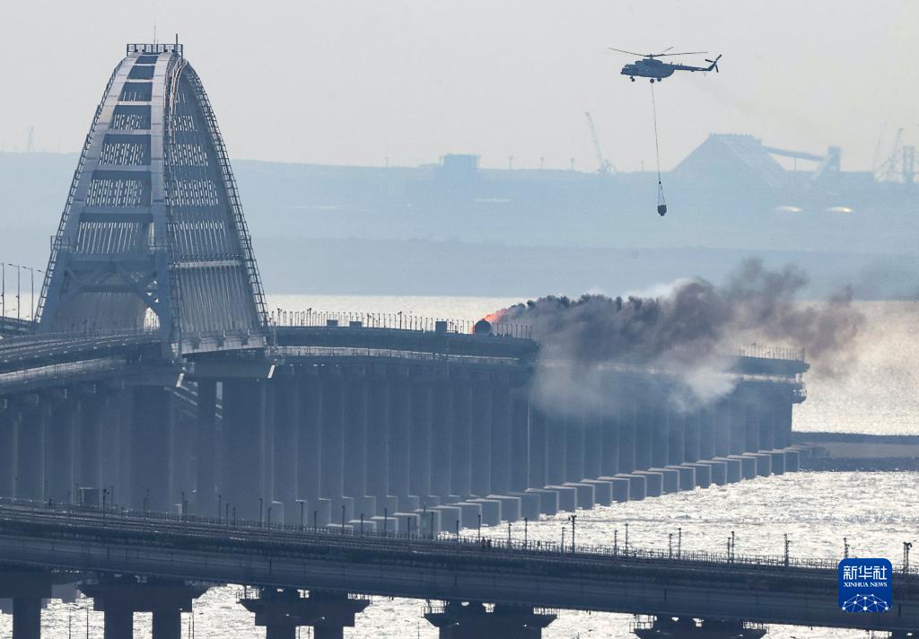 10月8日,直升机在克里米亚大桥起火现场灭火。新华社/塔斯社