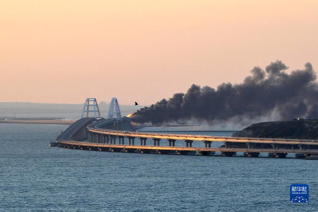 这是10月8日拍摄的克里米亚大桥起火现场。新华社/塔斯社