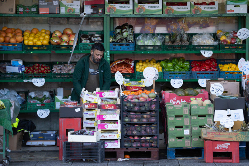 ↑10月7日,一名商贩在英国曼彻斯特街头售卖水果。