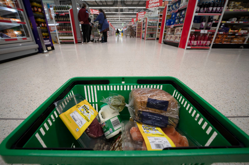 ↑10月7日在英国曼彻斯特一家超市拍摄的购物篮内的商品。