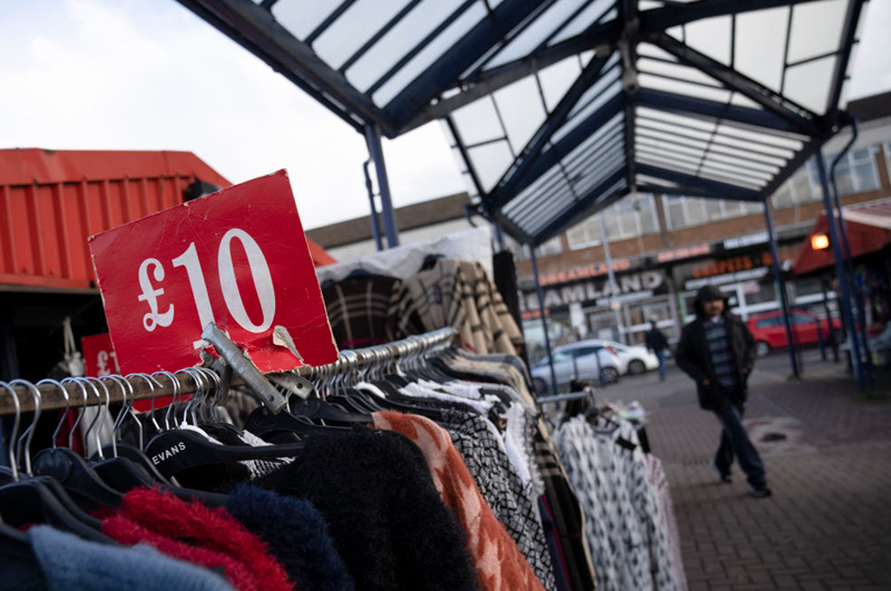 ↑10月7日在英国曼彻斯特拍摄的一处集市上售卖的衣物。