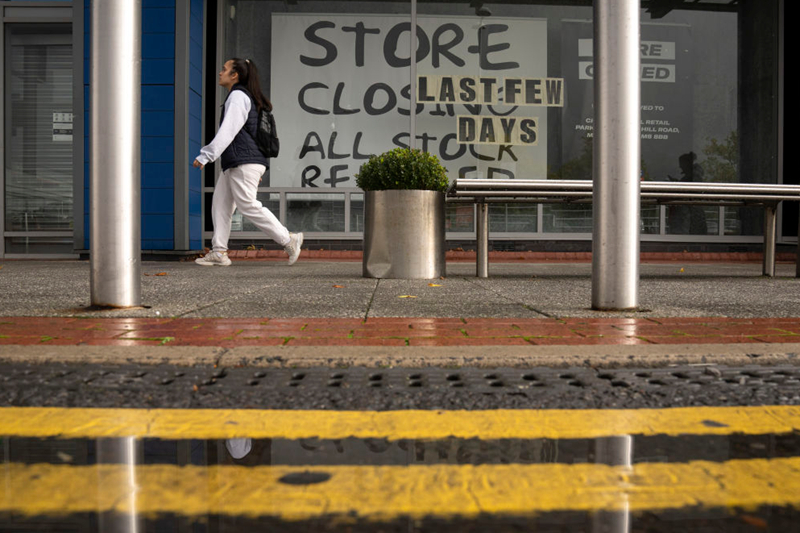 ↑10月7日,在英国曼彻斯特,一名行人走过一家关闭的店铺。