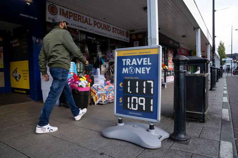 ↑10月7日,在英国曼彻斯特,一名男子走过一处货币兑换点。