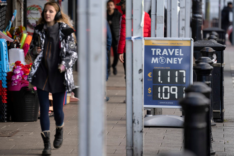 ↑10月7日,在英国曼彻斯特,一名女子走过一处货币兑换点。