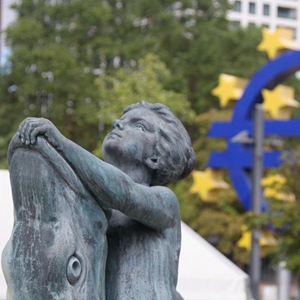 这是9月8日在德国法兰克福拍摄的欧元雕塑和一座喷泉雕塑。(新华社记者单玮怡摄)