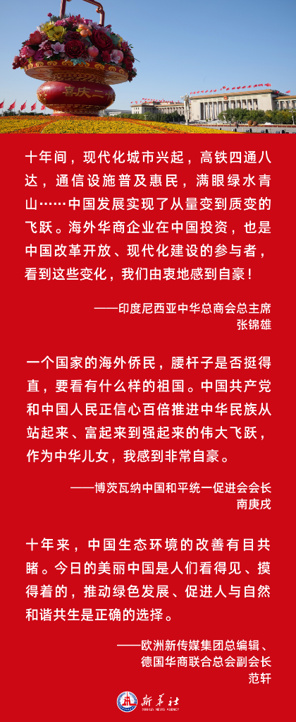 “十年来,每次回国我都能明显感受到祖国日新月异的发展变化。”印度尼西亚中华总商会总主席张锦雄说,“十年间,现代化城市兴起,高铁四通八达,通信设施普及惠民,满眼绿水青山……中国发展实现了从量变到质变的飞跃。海外华商企业在中国投资,也是中国改革开放、现代化建设的参与者,看到这些变化,我们由衷地感到自豪!”