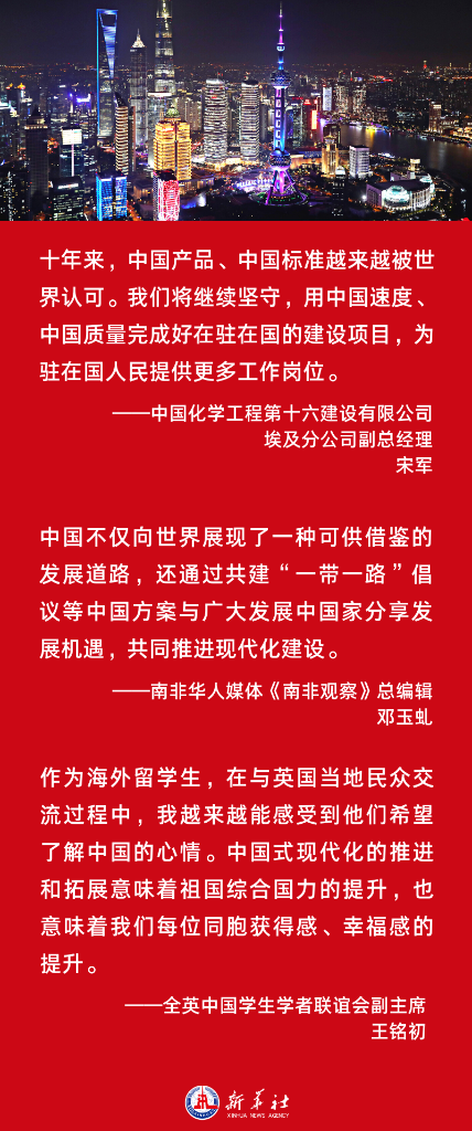 正在埃及工作的中国化学工程第十六建设有限公司埃及分公司副总经理宋军认真聆听了习近平总书记的报告。他说:“十年来,中国产品、中国标准越来越被世界认可。我们将继续坚守,用中国速度、中国质量完成好在驻在国的建设项目,为驻在国人民提供更多工作岗位。”他坚信,中国式现代化成果不仅使中国人民受益,也让世界人民受益,以中国式现代化全面推进中华民族伟大复兴的宏图伟业一定会取得成功。