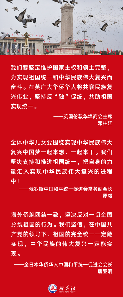 全日本华侨华人中国和平统一促进会会长唐亚明说,海外侨胞团结一致,坚决反对一切企图分裂祖国的行为。“我们坚信,在中国共产党的领导下,祖国的完全统一一定能实现,中华民族的伟大复兴一定能实现。”