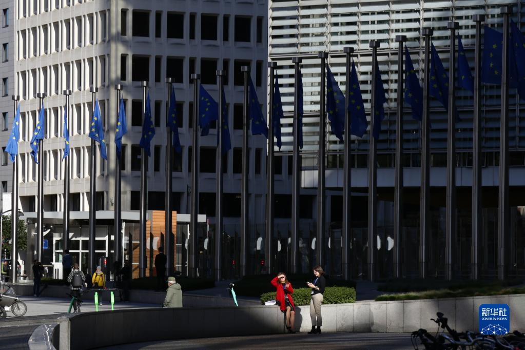 10月18日,人们在位于比利时布鲁塞尔的欧盟委员会总部大厦外交谈。