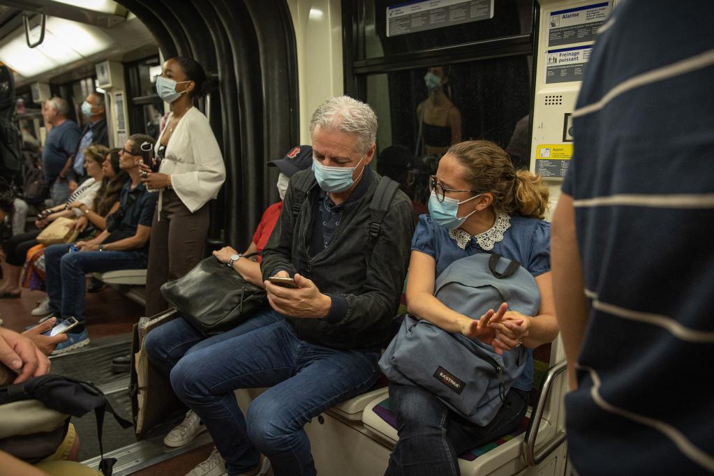 2022年7月8日,人们佩戴口罩在法国巴黎乘坐地铁。新华社发(奥雷利安·莫里萨尔摄)