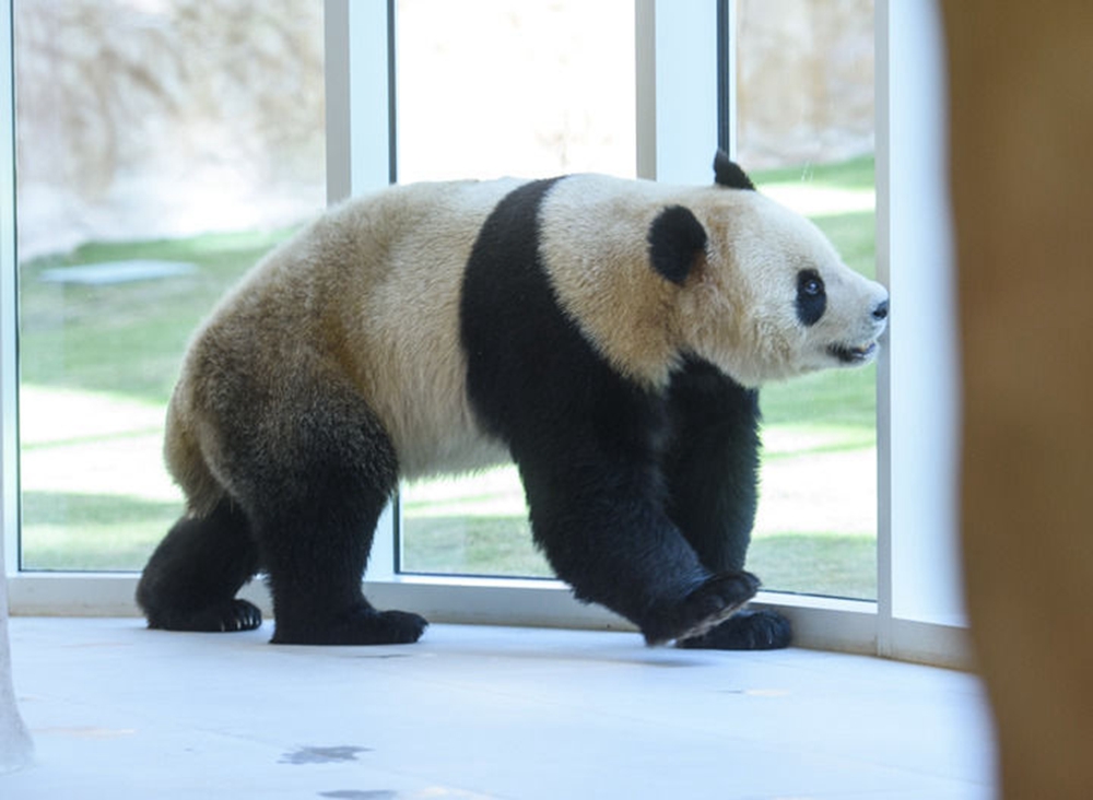 10月19日,大熊猫走在位于卡塔尔首都多哈的豪尔熊猫馆内。新华社发(尼库摄)