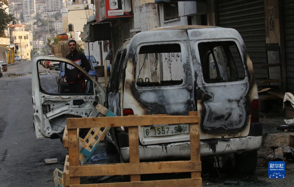 10月25日,在约旦河西岸城市纳布卢斯,一辆汽车在冲突中遭到损毁。新华社发(尼达勒摄)