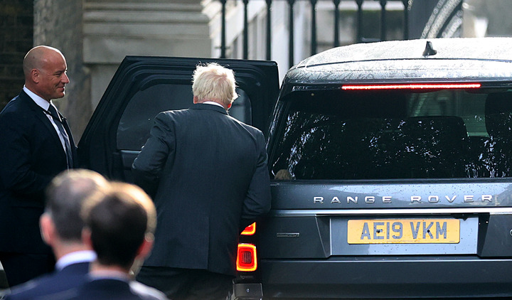 9月6日,在英国伦敦,鲍里斯·约翰逊(左二)在唐宁街10号首相府发表卸任前最后一次讲话后乘车离开。新华社记者李颖摄