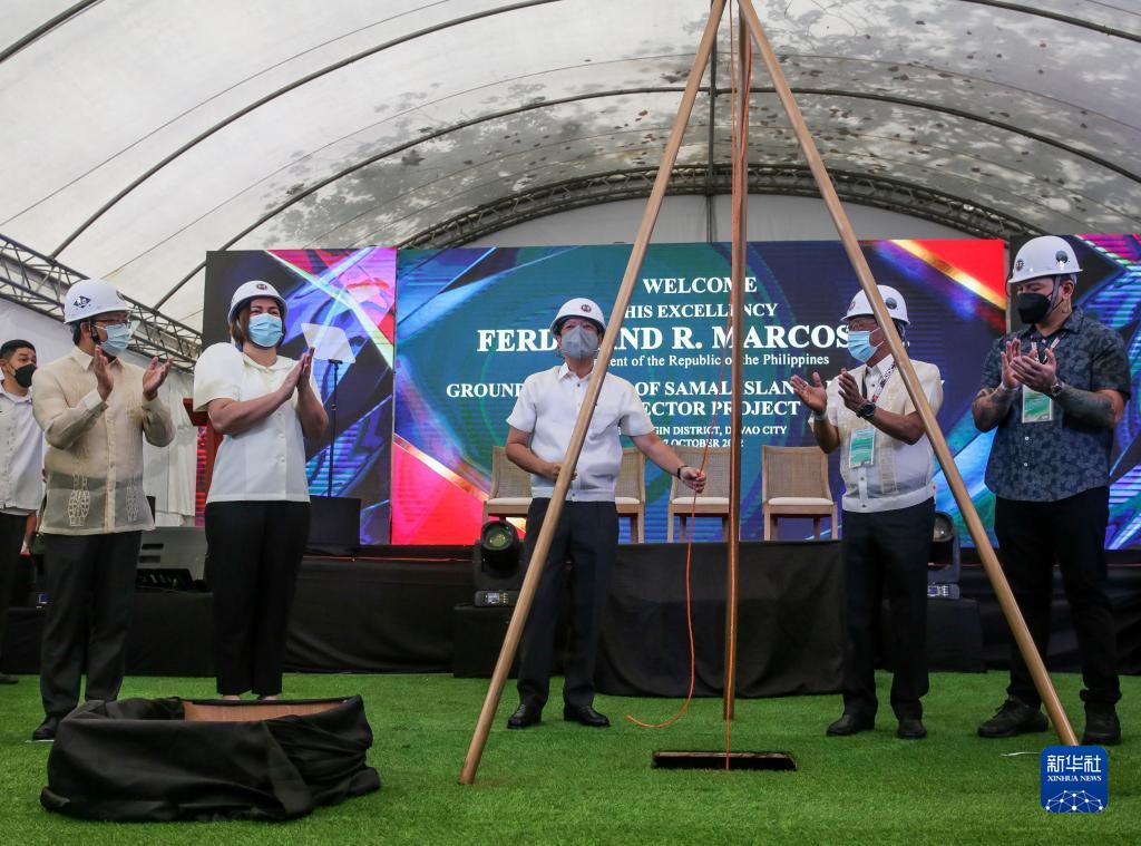 10月27日,菲律宾总统马科斯(中)与菲律宾副总统莎拉·杜特尔特(左二)、中国驻菲律宾大使黄溪连(左一)、菲律宾公共工程和公路部长曼努埃尔·博诺安(右二)、达沃市长塞巴斯蒂安·杜特尔特(右一)等在达沃-萨马尔岛大桥的开工仪式上埋设时间胶囊。