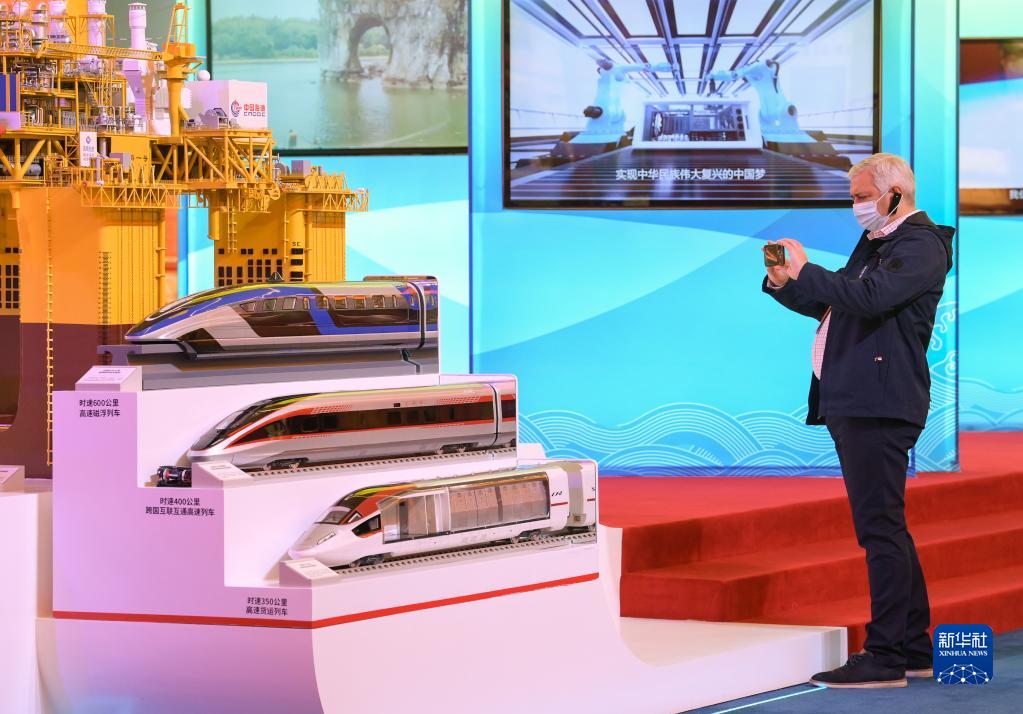 “天问一号”着陆器模型、“奋斗者”号全海深载人潜水器模型……室外展区,一件件展现新时代中国人上九天、下五洋壮志豪情的展品,吸引外宾们拍照留影。