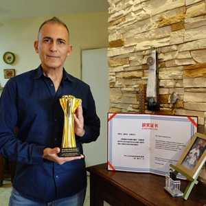 4月11日,以色列出版家皮埃尔·赫泽尔·拉维在位于耶路撒冷的家中与第十四届中华图书特殊贡献奖的奖杯和证书合影。新华社记者王卓伦 摄