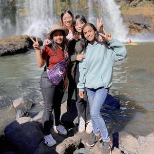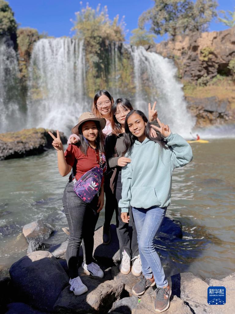 7月1日,塔那那利佛大学孔子学院青年教师吴仪(后排左)和朱思敏(后排右)与孔子学院的学生们一起游玩。新华社发(塔那那利佛大学孔子学院供图)