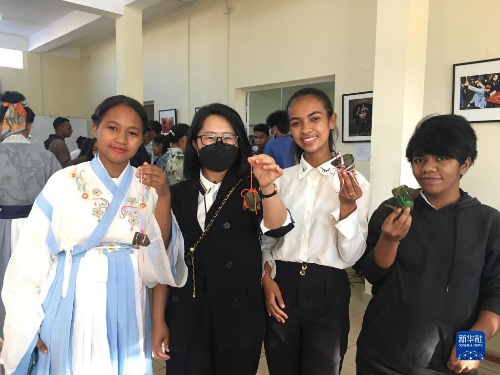 6月1日,塔那那利佛大学孔子学院青年教师胡紫娟(左二)与孔子学院的学生们一起体验包粽子。新华社发(塔那那利佛大学孔子学院供图)