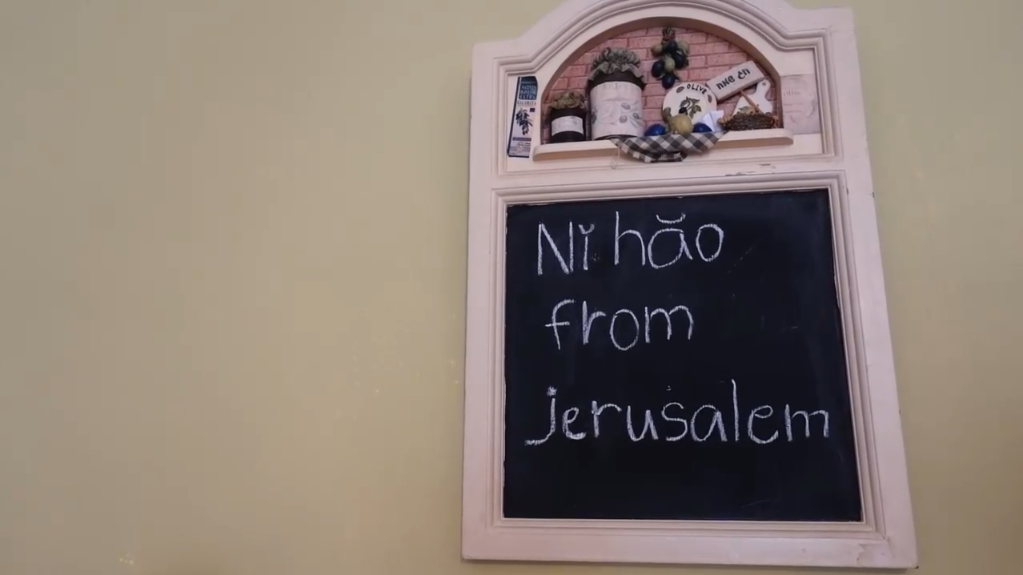 拉维家中写着“你好,来自耶路撒冷”的小黑板。视频截图