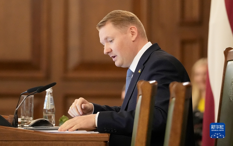 11月1日,在拉脱维亚里加的议会大厅,斯米尔滕斯当选议长后致辞。新华社发(埃迪斯·帕伦斯摄)