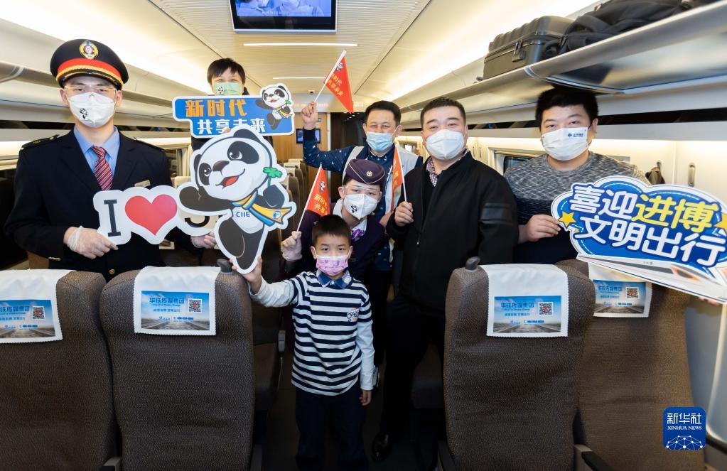 11月2日,在G1724次列车内,旅客与乘务人员为进博会送上祝福。