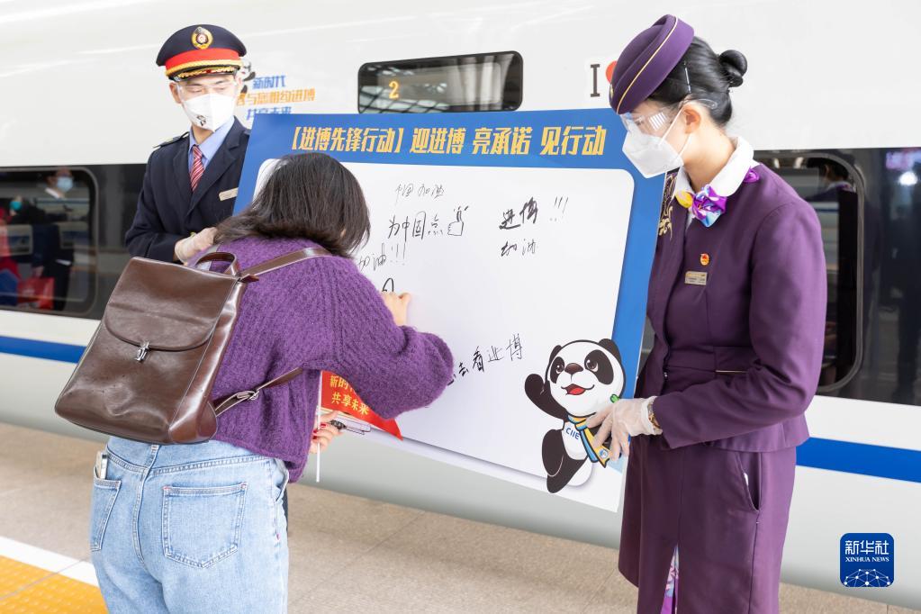 第五届中国国际进口博览会开幕在即,铁路上海客运段开展主题活动,向旅客介绍进博会亮点,邀请旅客一起为进博会送上祝福。