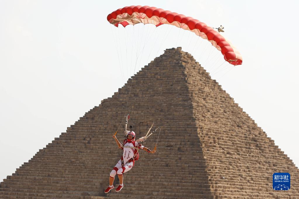 11月2日,在埃及吉萨金字塔景区,运动员进行跳伞表演。