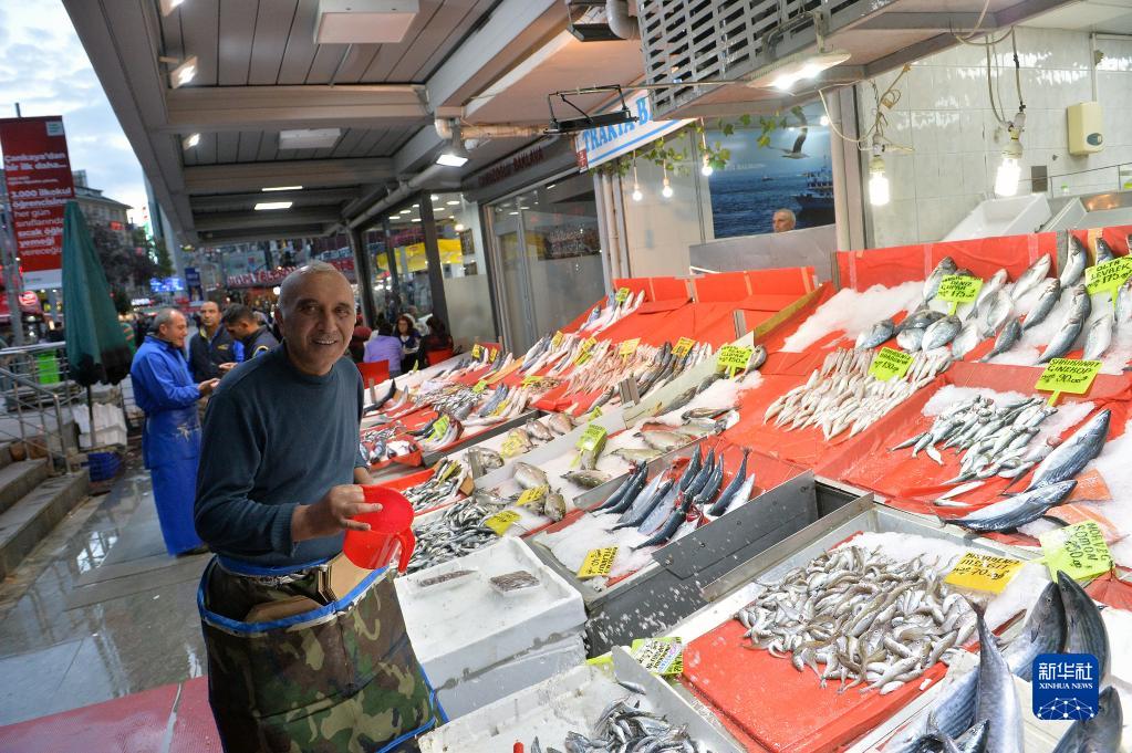 11月3日,在土耳其安卡拉,一名商贩在摊位卖鱼。