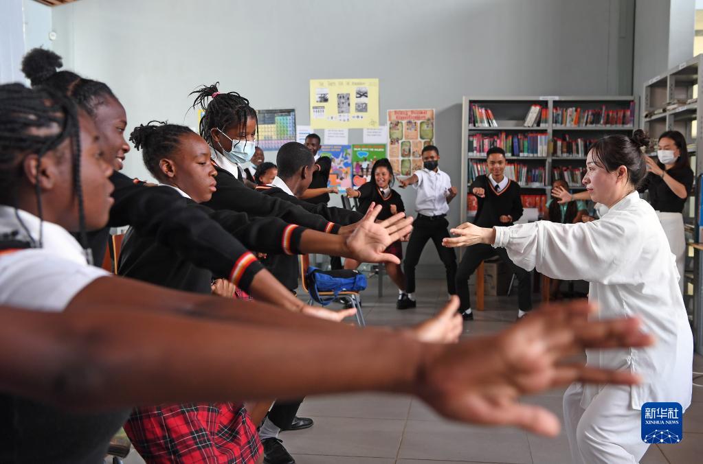 11月3日,在纳米比亚首都温得和克的毛泽东主席中学,学生在中国援纳医疗队医生的带领下学习八段锦。