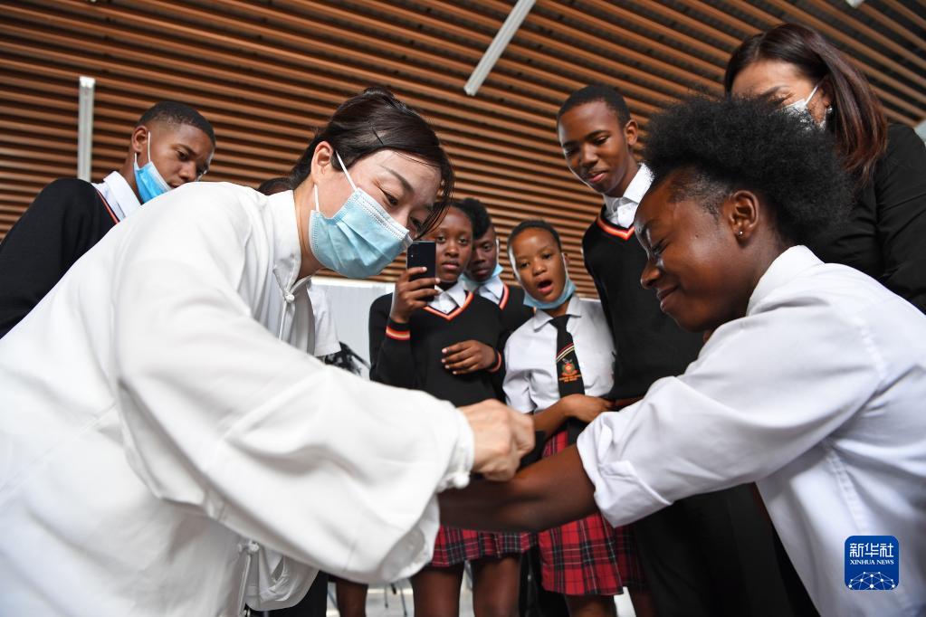 在纳米比亚首都温得和克的毛泽东主席中学3日的中文课上,第十四批中国援纳医疗队用银针、火罐作教具,以推拿、做操为内容,让同学们在轻松愉悦的学习中体验中国传统医学文化。