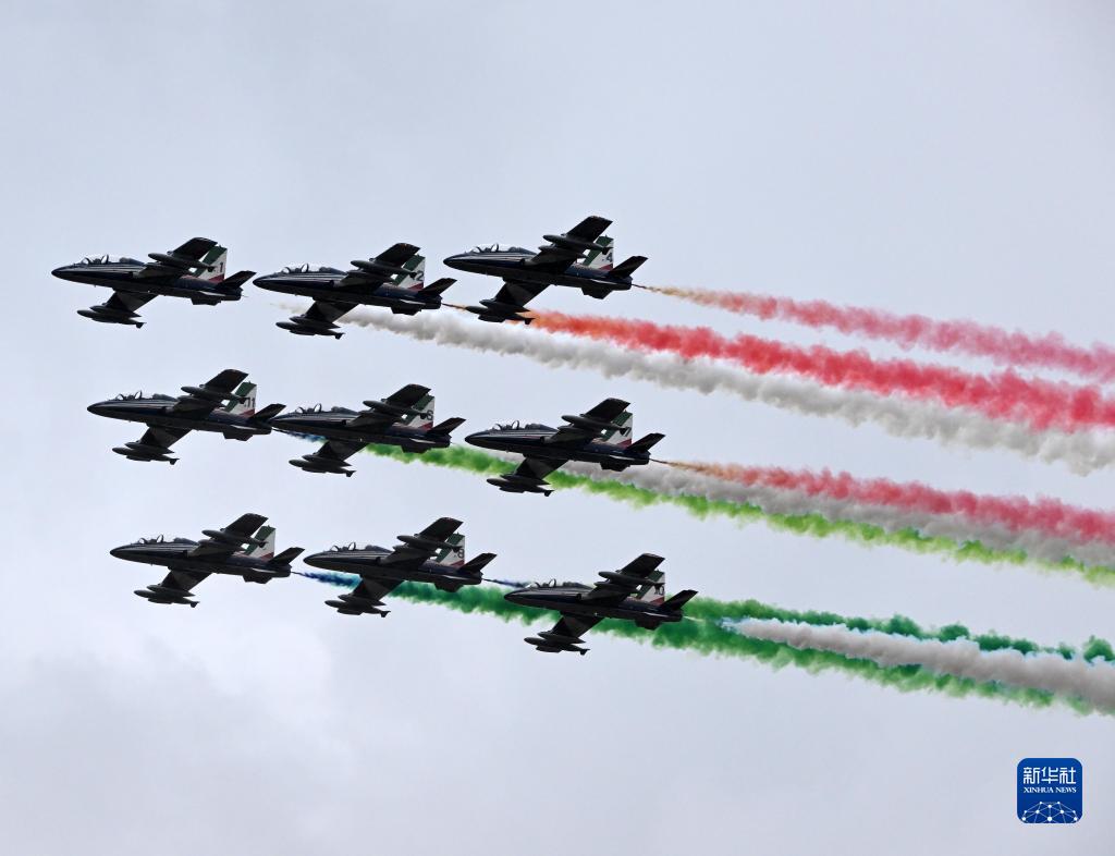 11月4日,意大利“三色箭”飞行表演队喷出象征国旗三色的烟雾飞过罗马上空,庆祝国家团结日。新华社发(阿尔贝托·林格利亚摄)