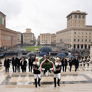 11月4日,意大利“三色箭”飞行表演队喷出象征国旗三色的烟雾飞过罗马威尼斯广场上空,庆祝国家团结日。新华社发(阿尔贝托·林格利亚摄)