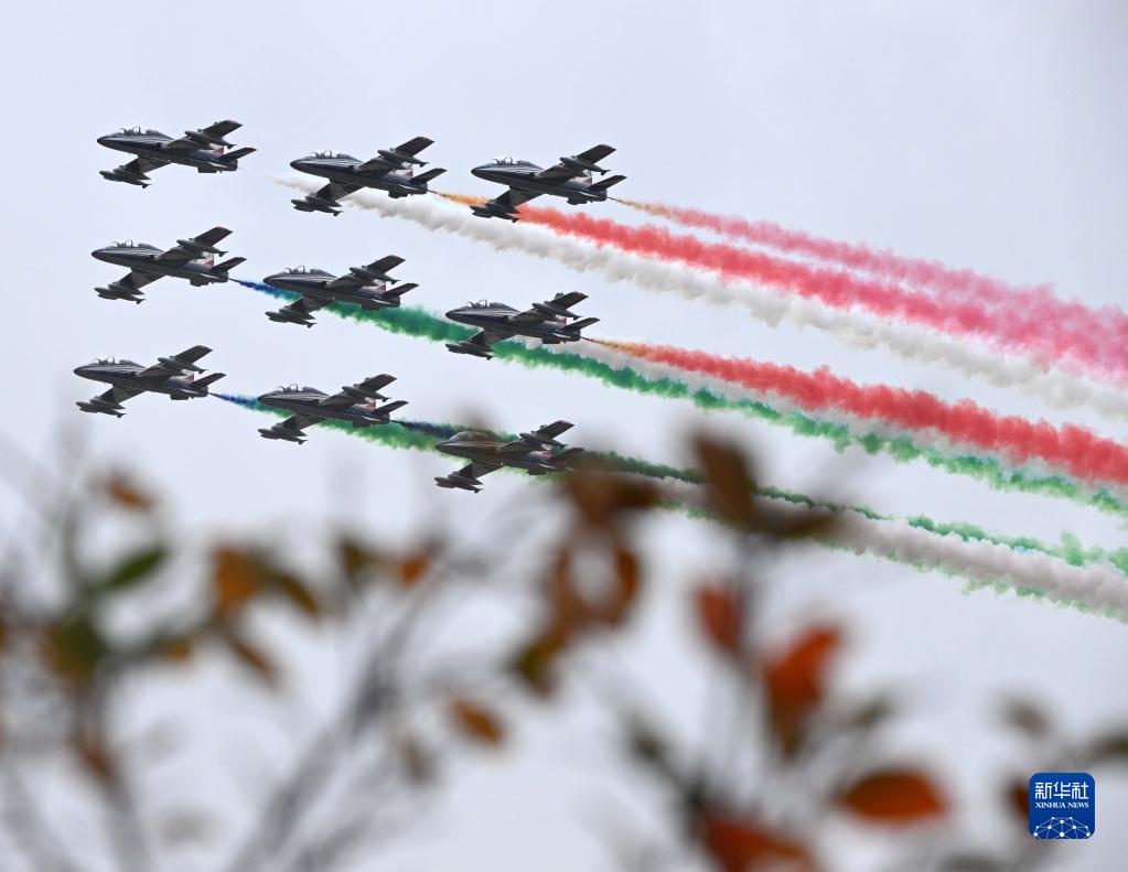 11月4日,意大利“三色箭”飞行表演队喷出象征国旗三色的烟雾飞过罗马上空,庆祝国家团结日。新华社发(阿尔贝托·林格利亚摄)