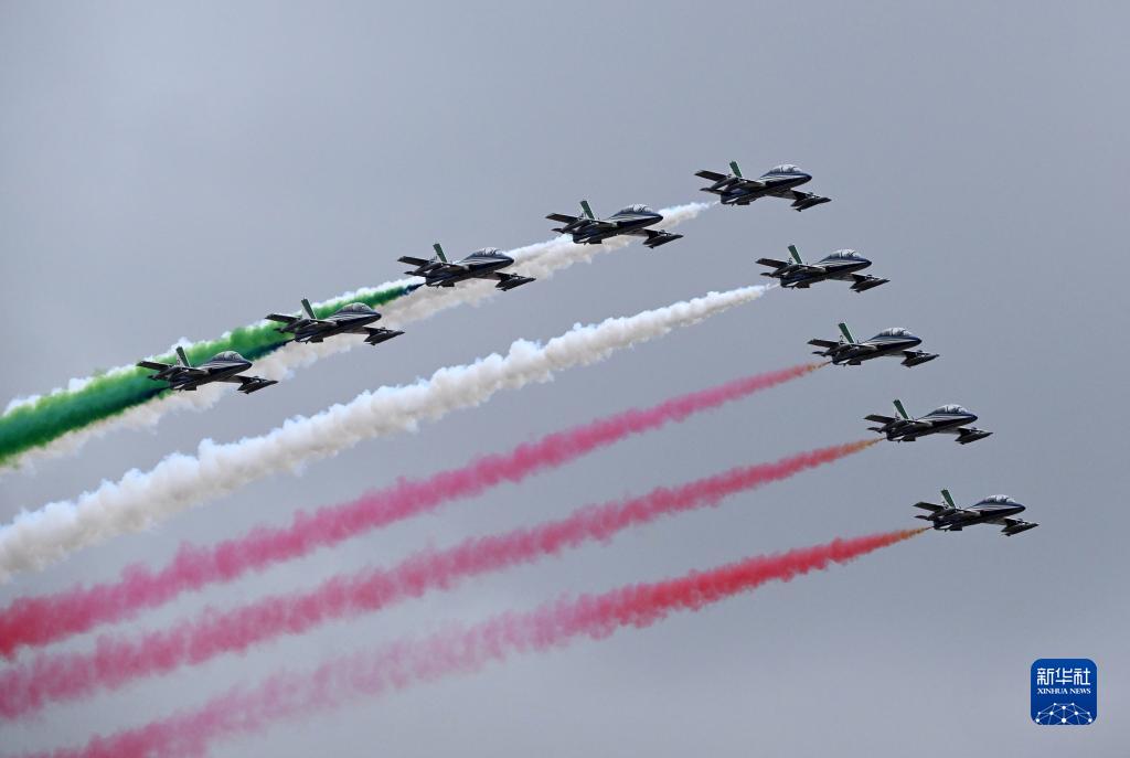 11月4日,意大利“三色箭”飞行表演队喷出象征国旗三色的烟雾飞过罗马上空,庆祝国家团结日。新华社发(阿尔贝托·林格利亚摄)