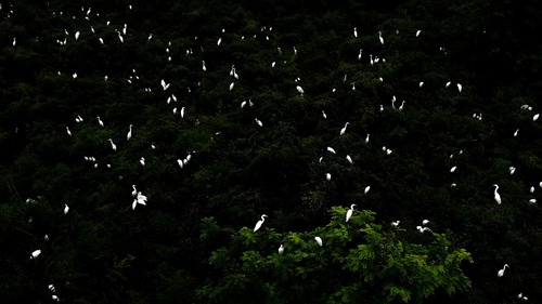 在位于盐城东部沿海的大丰麋鹿国家级自然保护区,一群白鹭在树顶栖息。新华社记者李响摄