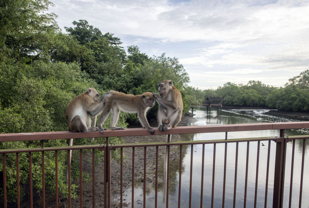 ↑三只长尾猕猴在双溪布洛湿地保护区的栏杆上小憩。