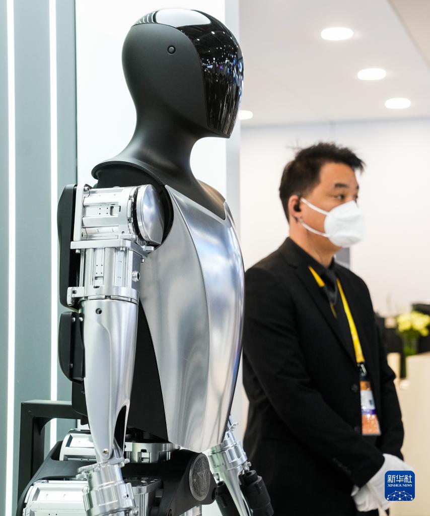 11月5日在第五届进博会汽车展区拍摄的特斯拉人形机器人。