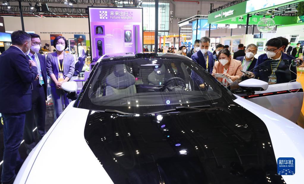 11月5日,参观者在第五届进博会技术装备展区的电动车前交流。