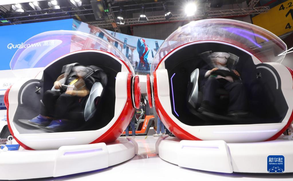 11月5日,参观者在第五届进博会技术装备展区体验一款VR游戏座椅。