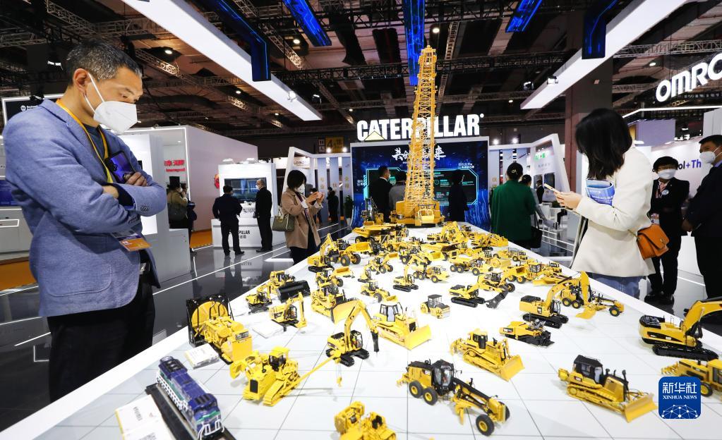11月5日,参观者在第五届进博会技术装备展区参观工程机械模型。