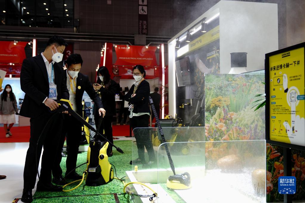11月6日,观众在第五届进博会消费品展区体验高压清洗机。