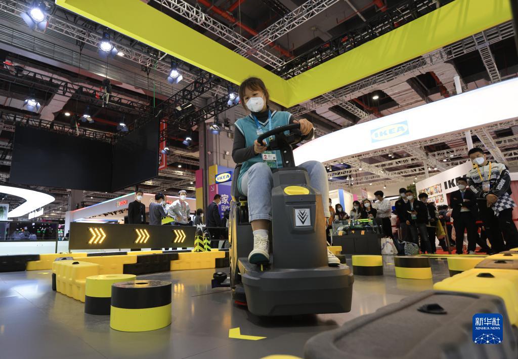 11月6日,参观者在第五届进博会消费品展区体验“洗地机”。