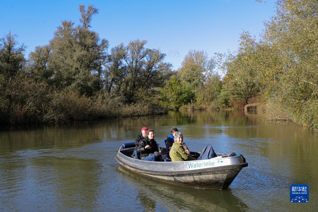 在荷兰多德雷赫特,人们乘船游览比斯博斯国家公园风光(11月2日摄)。
