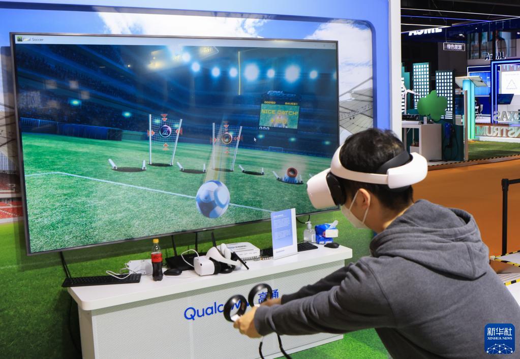 11月7日,参观者在第五届进博会美国高通公司展台参加5G无界XR赛事体验。