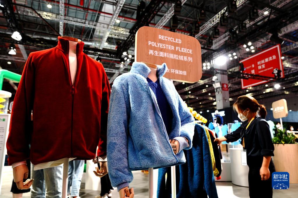 11月7日,优衣库参展人员在第五届进博会上介绍参展的环保服装,该服装面料采用源自回收塑料瓶的再生聚酯纤维。