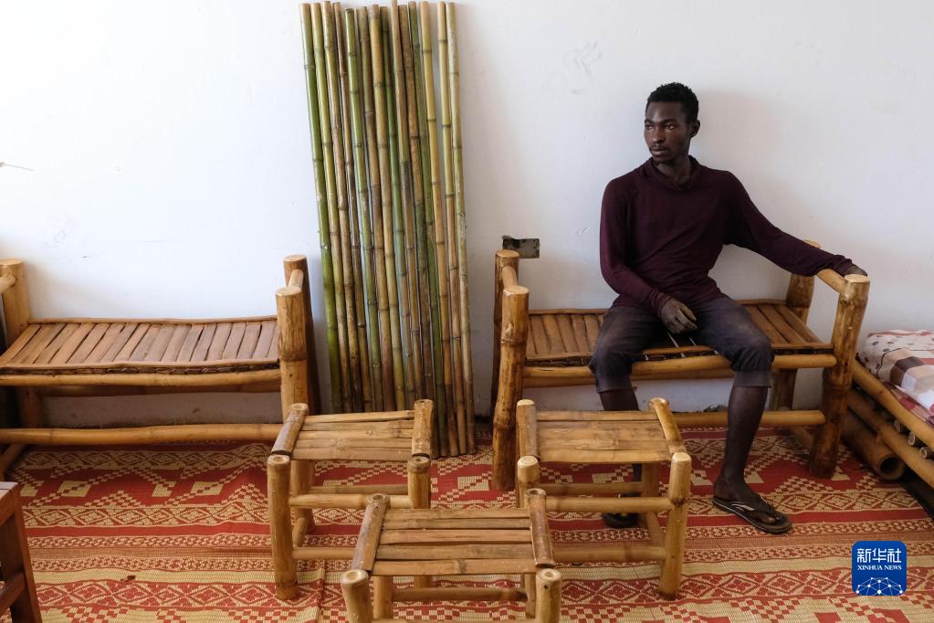 10月26日,在乌干达首都坎帕拉,乌干达竹子协会的工作人员展示竹椅。