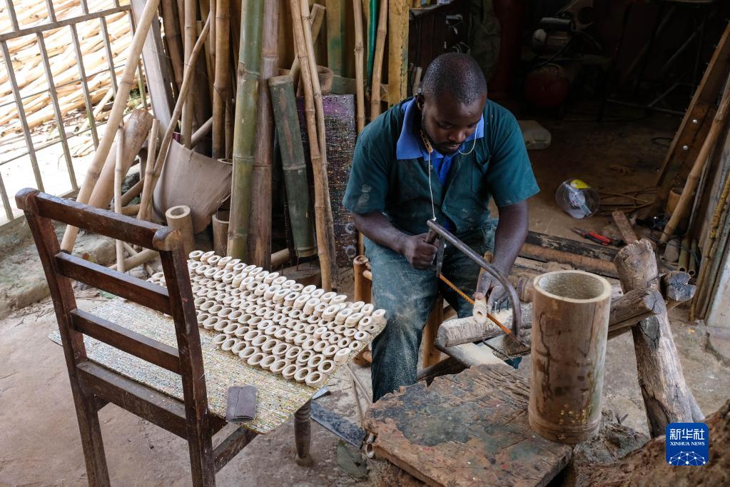 10月26日,在乌干达首都坎帕拉,乌干达竹子协会的工作人员切割竹子制作饰品。